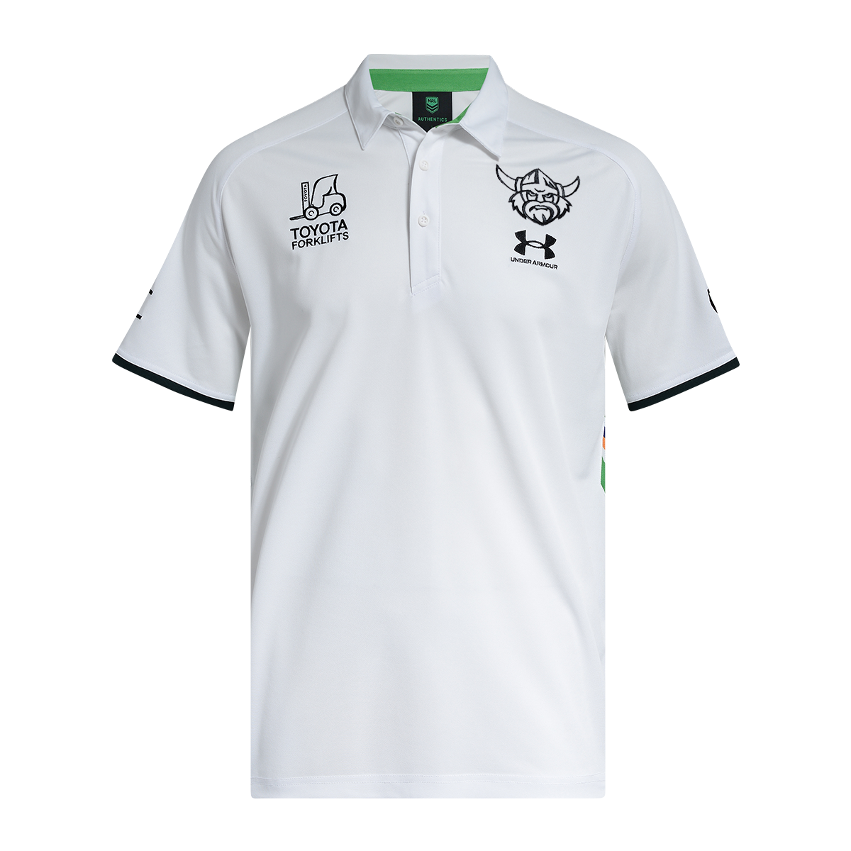Canberra Raiders 2026 Polo in predominantly white serves as a great base to show off the club and sponsor logos. Hints of Raiders Lime and Daintree colours add a striking contrast.